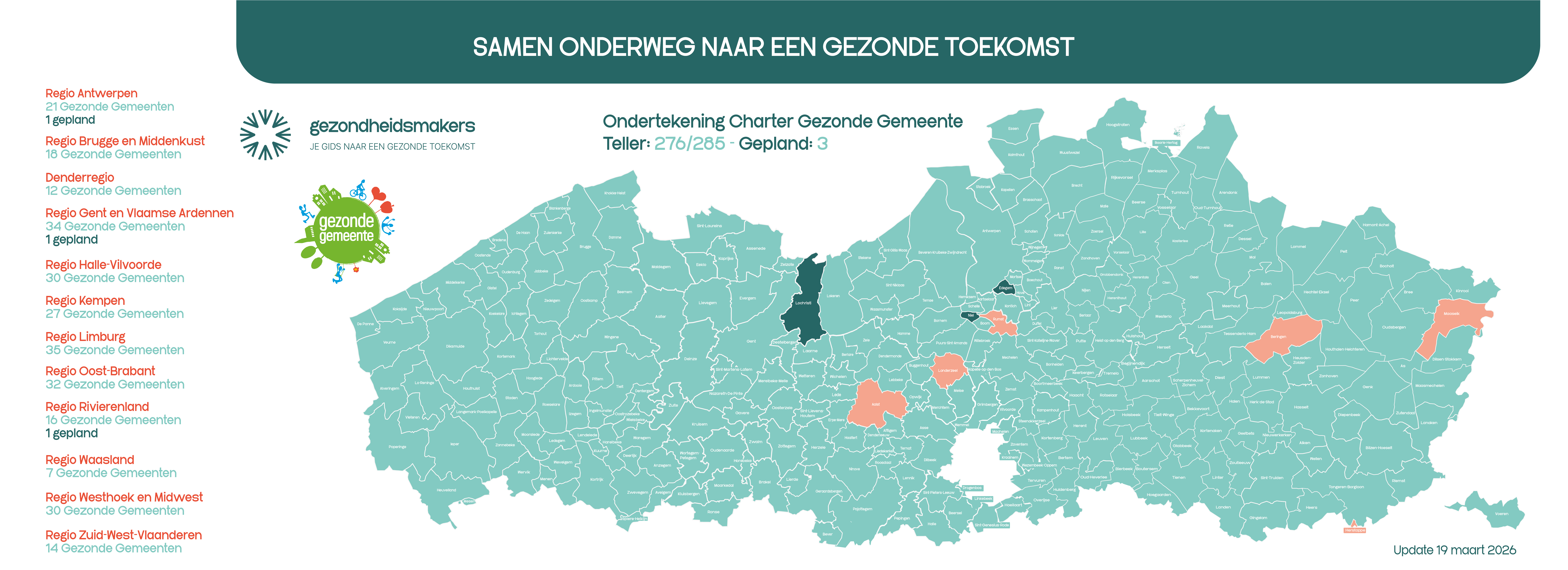 Vlaanderen bereikt een record: 276 van de 285 gemeenten ondertekenden het Charter Gezonde Gemeente en engageren zich vandaag om preventieve gezondheid structureel te verankeren in hun lokaal beleid. Nog drie andere besturen kondigen aan dat ze in 2026 volgen. Daarmee staat preventie meer dan ooit op de agenda van steden en gemeenten.
