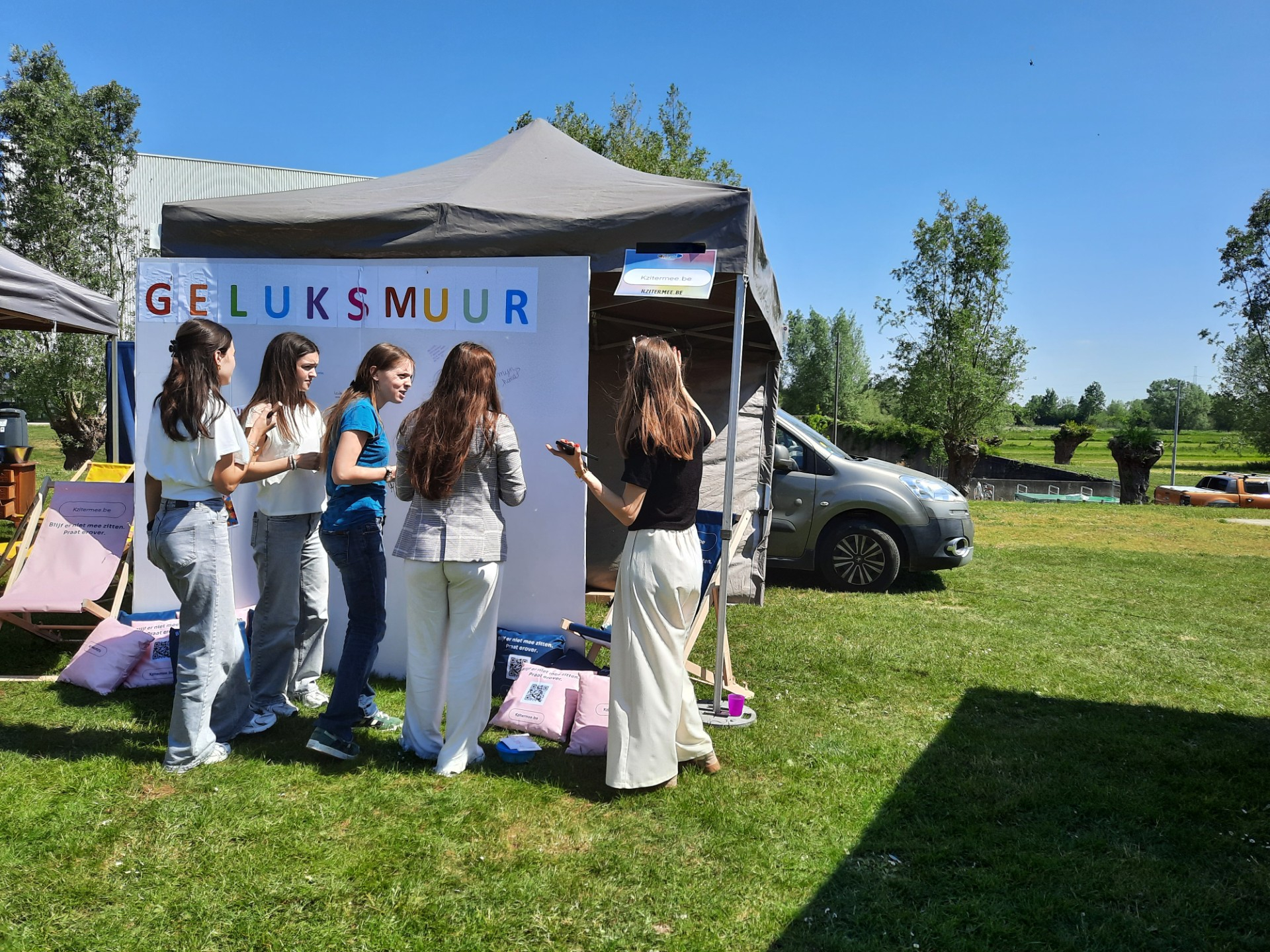 Partners organiseerden creatieve activiteiten zoals een geluksmuur, buttons maken met quotes, of een polaroidstand waar jongeren een herinnering konden vastleggen. De randanimatie — van bumperball tot een DJ en wereldse dessertjes — zorgde voor een ontspannen sfeer. “De markt vond plaats tijdens de middagpauze. Ingeschreven jongeren mochten de school verlaten en hun lunch opeten op onze markt,” vertelt Laurence.